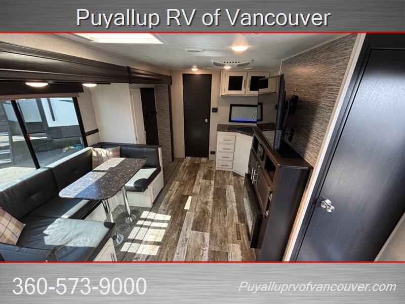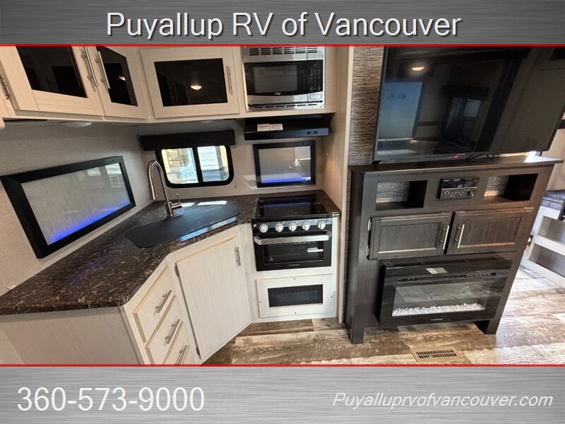 - Exterior: 20' power awning, "Campfire Cafe" outdoor kitchen, and pass-through storage.