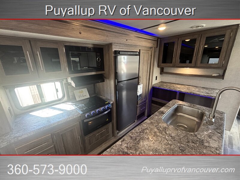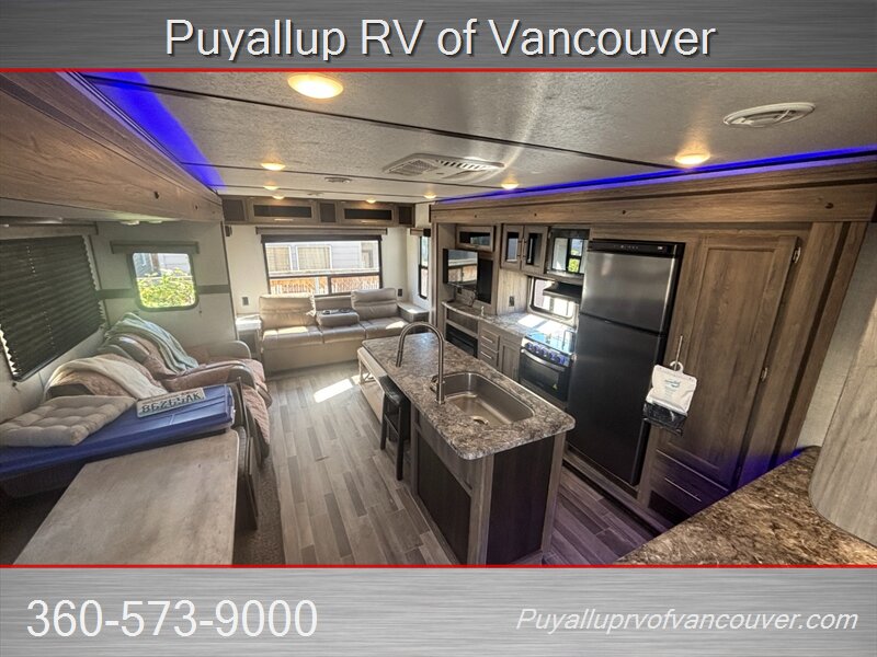- Living Area: Rear entertainment center with fireplace option, LED lighting, and large slide-outs.