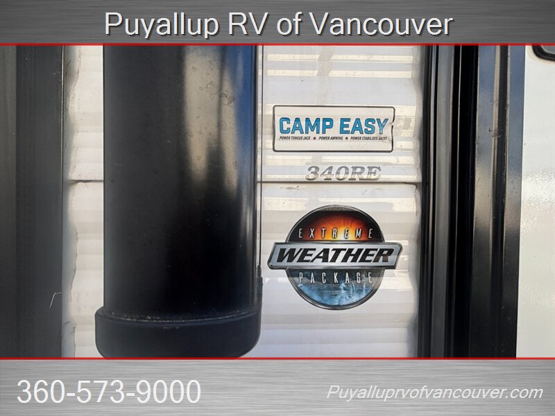The 2021 CrossRoads Zinger 340RE is a 38-foot travel trailer featuring three slideouts and a rear entertainment layout, designed to sleep up to 6 people. It has a dry weight of approximately 8,829 lbs, a hitch weight of 1,058 lbs, and includes a 51-gallon fresh water tank, 78-gallon gray tank, and 39-gallon black tank.