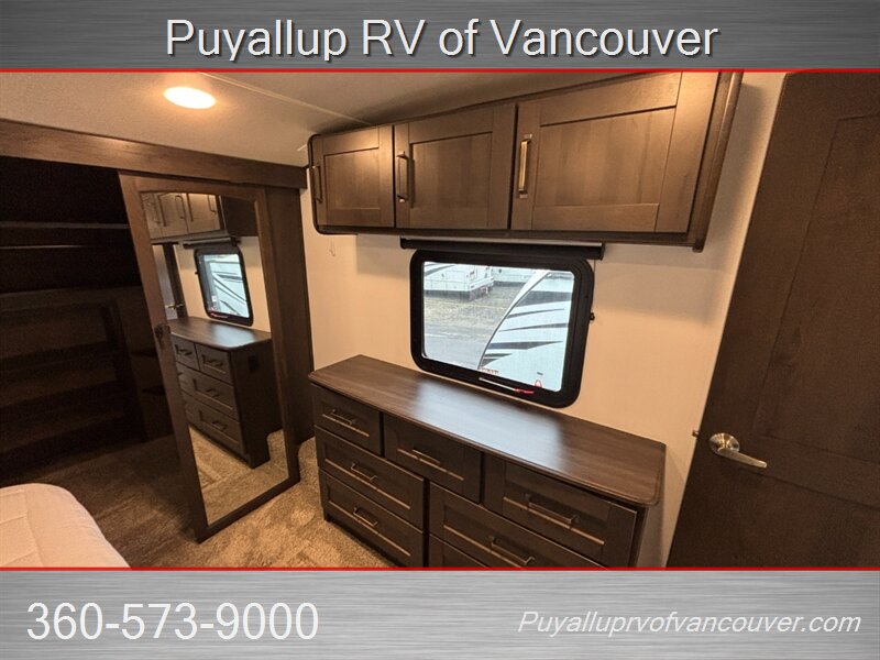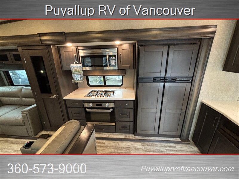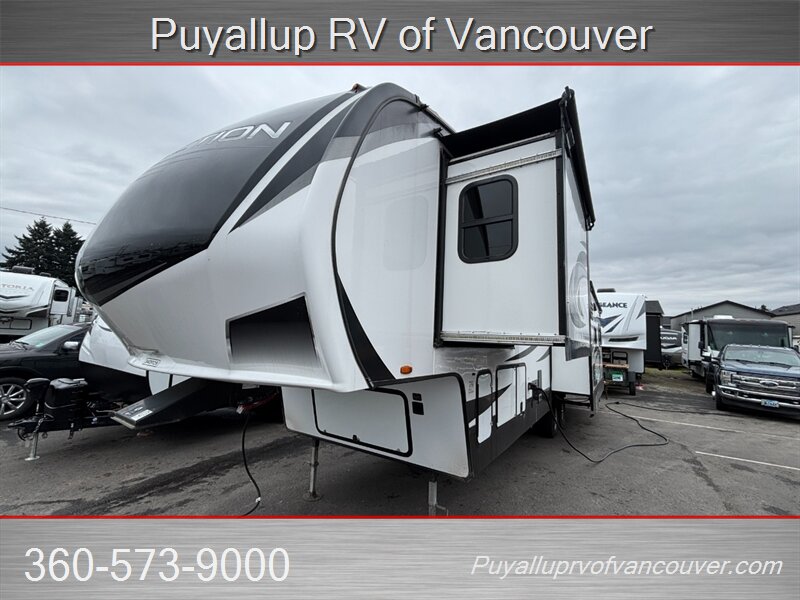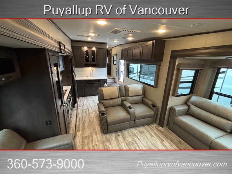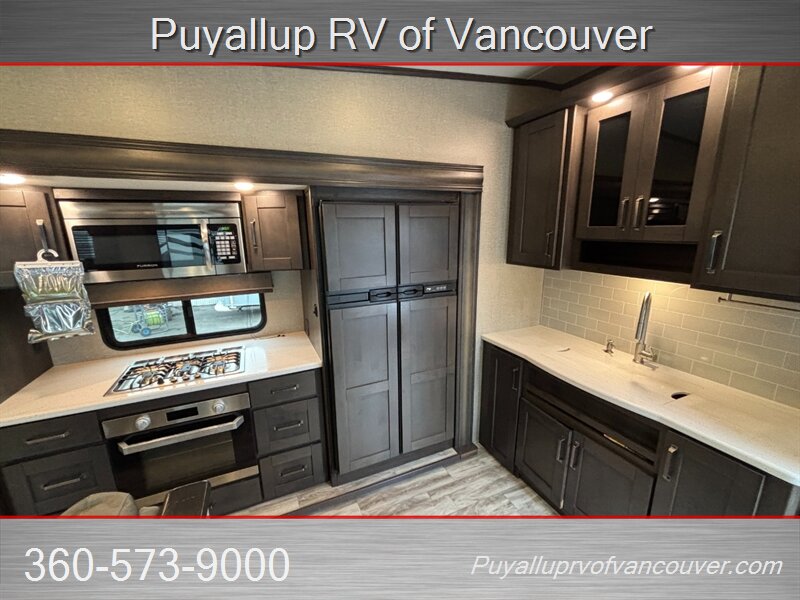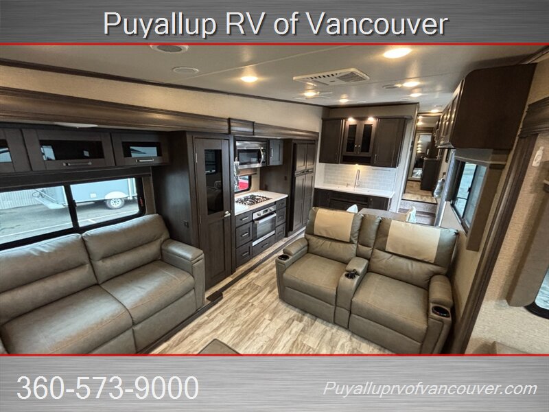 This luxurious fifth wheel, focusing on rear-den living comforts with dual sleeper sofas and theater style seating, quite possibly be what's needed for your family's next outdoor adventure or full-time living home.